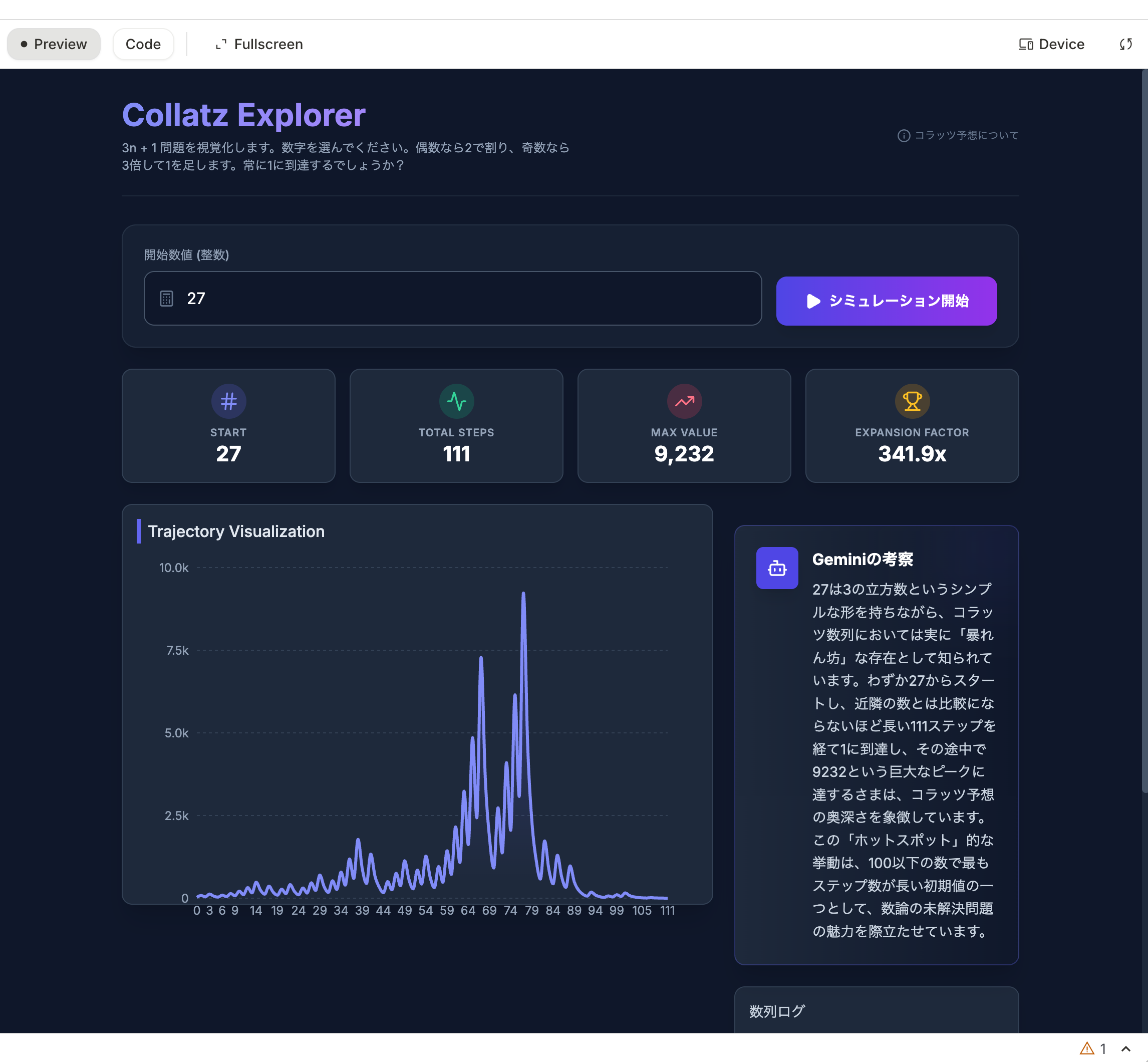 初期値を与えて1に到達するまでの過程を可視化するツール*1をGoogle AI Studioで作ってみました。横軸はステップ数、縦軸は操作途中の数値です。たとえば「27」で開始すると 111 ステップを経て終了することがわかります。その過程でなんと 9232 というでかい数値が出てきたりします。また、自分の年齢の「32」は2nの数なので単調減少型であることが視覚的も確かめられます。波形のパターンで分類してみたい。